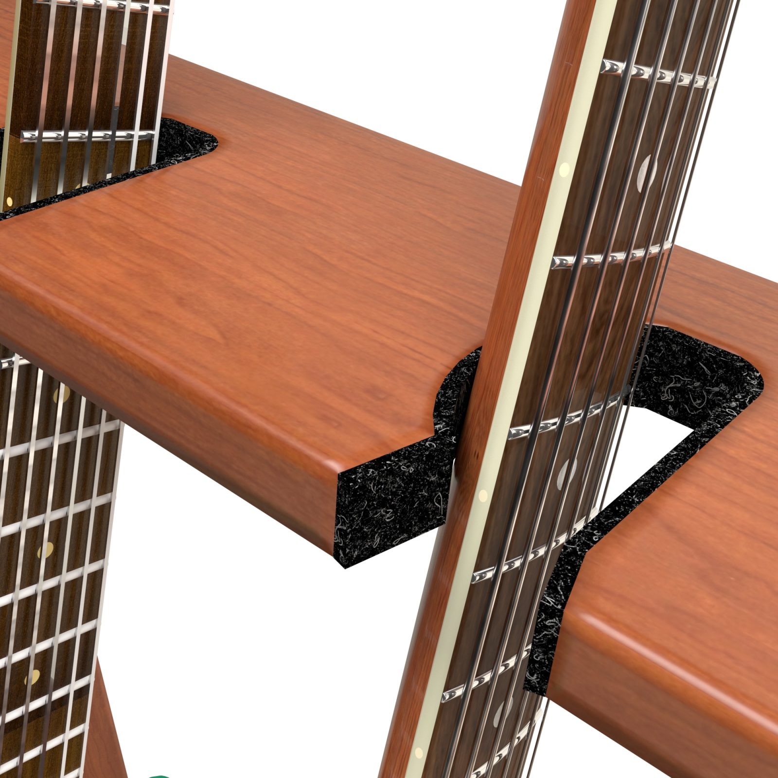 This rack holds most electrics, acoustics, basses, and even banjos. It’s designed for guitars with curved bottoms and standard body sizes.