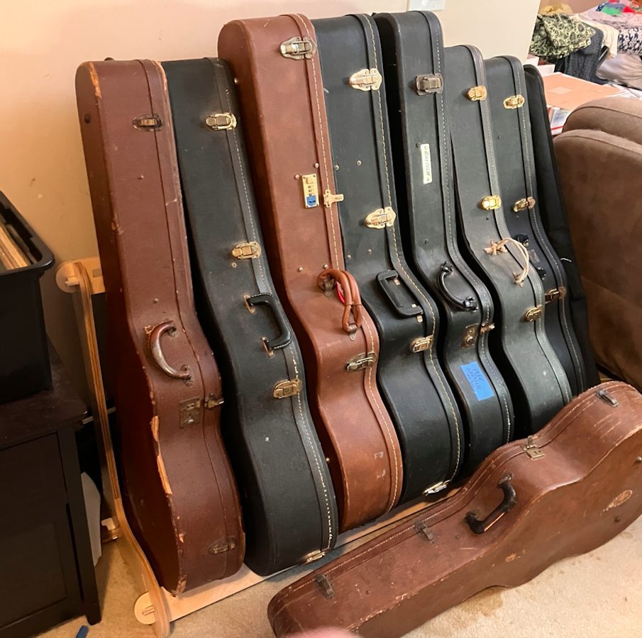 16. Easily accommodates cases for three solid body electrics, two hollow-body cases, and a dreadnaught case…with room for one more of any of the above. Amazingly quick and simple to assemble, and the baltic birch is very sturdy.